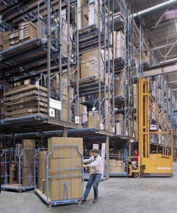 The FurniBox is particularly well suited for the use of narrow-aisle forklifts, for which an aisle width of only 1,80 m is adequate. Furthermore, by means of an order picker, you can conveniently steer for the desired rack sites with an empty FurniBox, remove goods stored there individually and further transport them safe and sound.