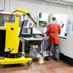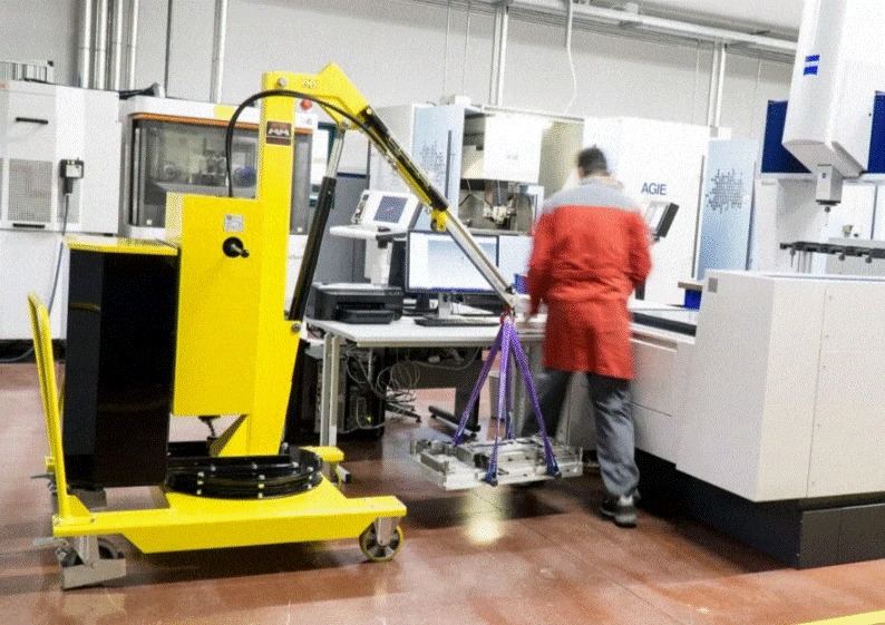 The counterbalanced cantilever mini crane model 01B2SE_1000 is part of a complete range of counterbalanced 360° swivel cranes with manual traction, , with a maximum capacity up to 200 kg and outreach up to 1910 mm. Hydraulic lever controlled or electric controlled. They represent the most cost-effective and flexible solution for lifting and transporting loads in several applications such as machining centers and machine tools, delivery to assembly lines, assembly operations, goods handling. Thanks to their compact dimensions they are easily maneuverable even at full load and can be moved effortlessly in confined spaces. All components are made in Italy to ensure the highest construction quality and the absence of defects. The hydraulic system is equipped with a lock valve that prevents the load from falling in case of accidental breakage of the pipes and a rough valve that prevents overloading of the crane. They are equipped with 2 high-capacity pivoting wheels with bumper mounts and parking brakes and with 2 fixed front wheels with bearings. The frame is made of painted steel and is equipped at the base with 2 useful forklift supports (to lift and transport the crane in complete safety on long distances. The sturdy push handle can be disassembled. There are also 2 handles to easily rotate the ballast. Swivel hook type. Rotating Jib arm with 8 locking positions. The counterbalanced cantilever mini crane model 01B2SE_1000 is equipped with an electric controlled jib arm . It is equipped with a 4 way fine control lever controls for :