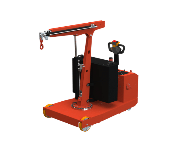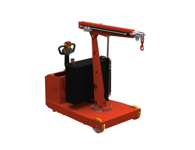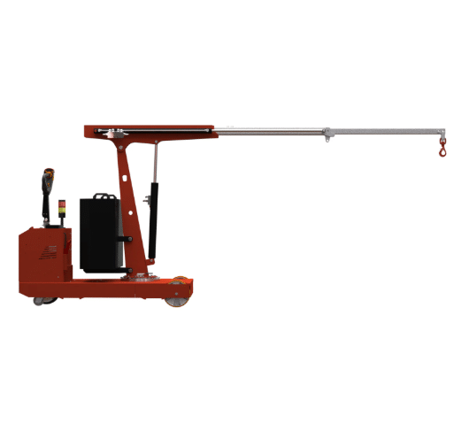 The FLEX G750DBL is a mobile counterbalanced swivel crane with electric drive that allows lifting of loads of up to 750 kg. It is equipped with a double telescopic boom that ensures a reach of 2400 mm. The rotation of the slewing ring, which can be locked every 30°, is done manually and is facilitated by the presence of bearings and two ergonomic handles located on the upper part of the ballast. Equipped with 2 fixed wheels and a wheel motor connected directly to the tiller for maximum manoeuvrability in tight spaces. Standard features: maintenance-free sealed AGM batteries, external battery charger, LED stack tower lights indicating correct crane operation and overload warning, emergency stop. The Flex G750DBL crane also has a multifunctional display showing charge level, battery voltage and hours of operation.