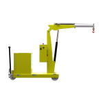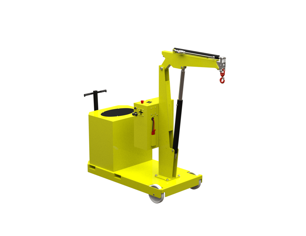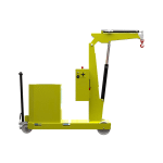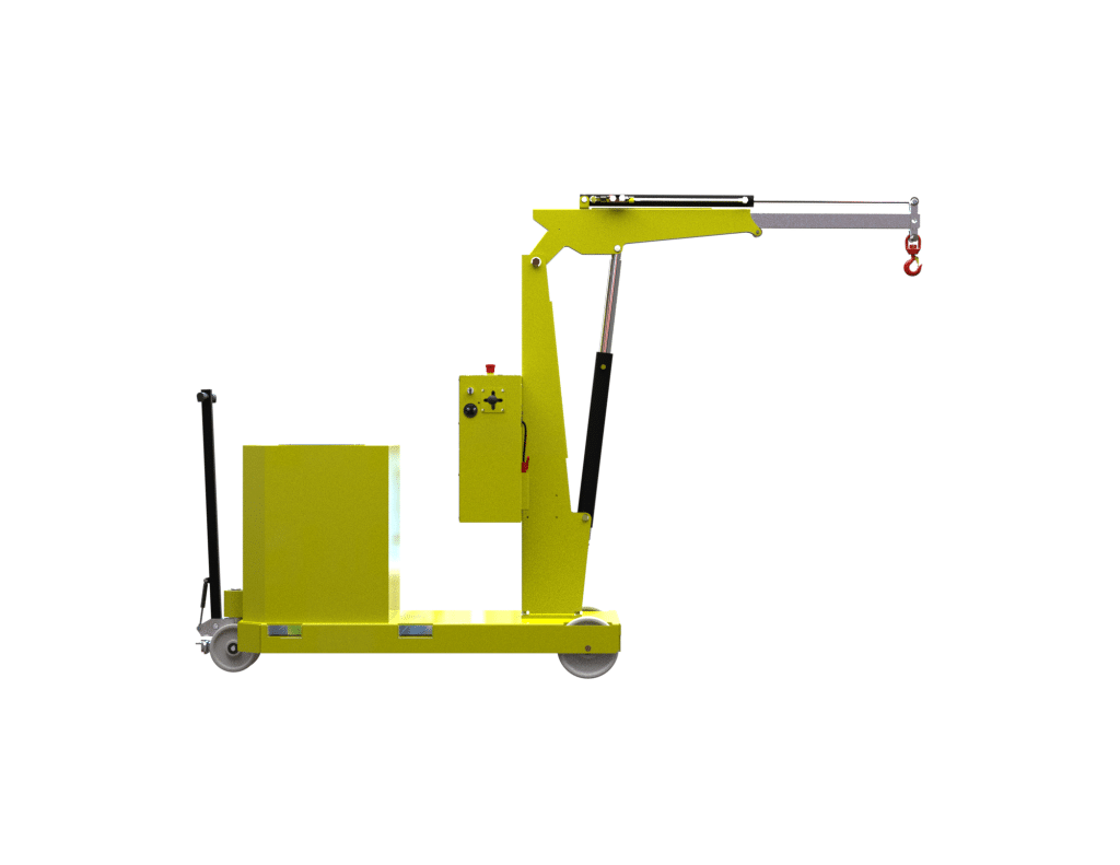 The counterbalanced mobile floor crane model GZ1000BSE is part of a complete range of counterbalanced cranes with manual traction, with a maximum capacity up to 1.000 kg and outreach up to 2.000 mm. Hydraulic lever controlled fast lift double action pump or electric controlled. They represent the most cost-effective and flexible solution for lifting and transporting loads in several applications such as machining centers and machine tools, delivery to assembly lines, assembly operations, goods handling. Thanks to their minimum frontal footprint of just 800mm they can be moved in narrow lanes and spaces and are easily maneuverable even at full load without efforts. All components are made in Italy to ensure the highest construction quality and the absence of defects. The hydraulic system of this counterbalanced mobile floor crane is equipped with a lock valve that prevents the load from falling in case of accidental breakage of the pipes and a rough valve that prevents overloading of the crane. Tiller arm equipped with gas spring and double wheels Ø 200 mm with ball bearings and braking system; 2 fixed front wheels Ø 250 mm with bearings to make it easy to move. The frame is made of painted steel and is equipped at the base with 2 useful forklift supports to lift and transport the crane safely on long distances. 360 ° swivel hook type. The counterbalanced mobile floor crane GZ1000BSE is equipped with an electric controlled jib arm. It is equipped with a 4 way fine control lever controls for :